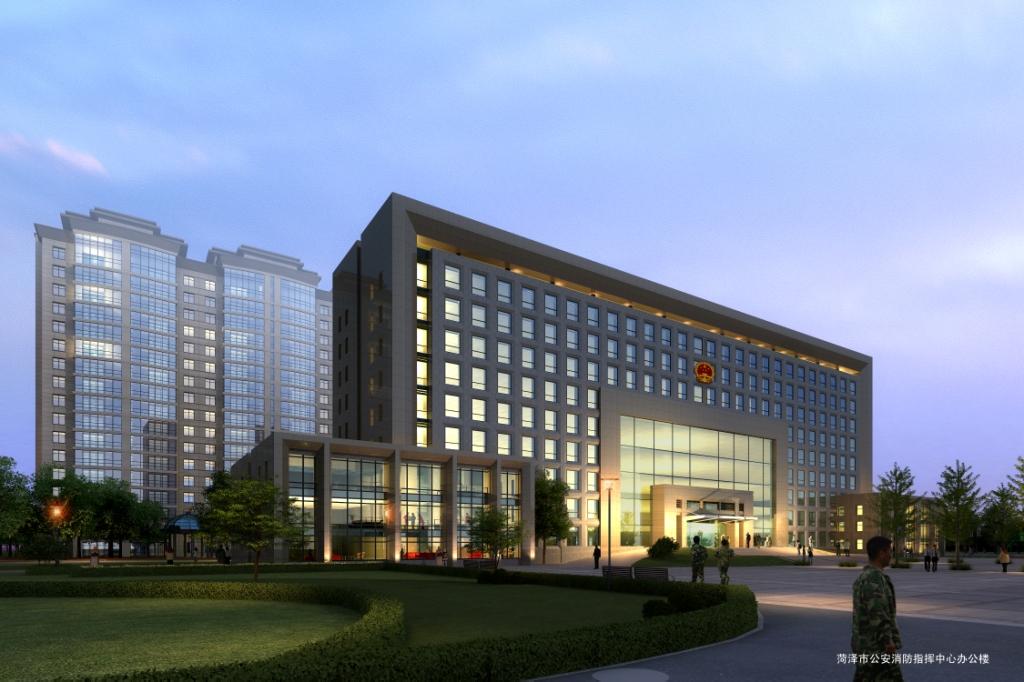 菏泽消防指挥中心院区占地3万㎡总建筑面积4. 5万㎡,指挥中心9层,建筑面积1.2万㎡,主要功能为办公、会议、调度指挥等。1#、2#干部公寓楼为18层,高度55.2米,总建筑面积3.2万㎡,附属楼功能为食堂。