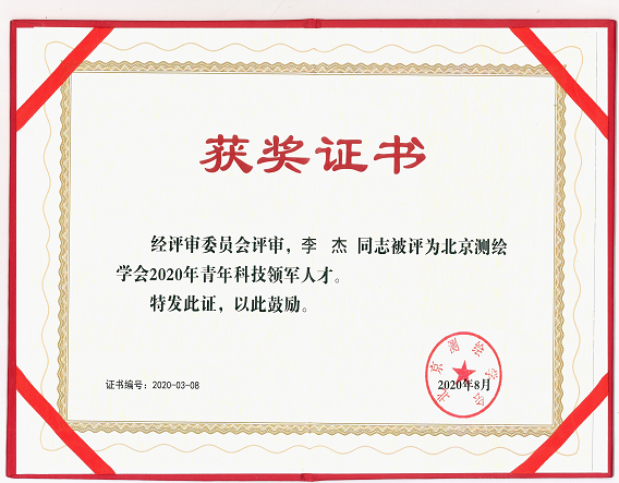 近日,北京测绘学会2020年学术年会暨北京市科协学术月活动在北京成功举行。北京市测绘同仁齐聚一堂,共同探讨“新基建 新测绘 新发展”。 会上颁发了“2020年度北京测绘学会青年科技领军人才”奖,航天设计院勘察设计研究院副总工李杰获此殊荣。