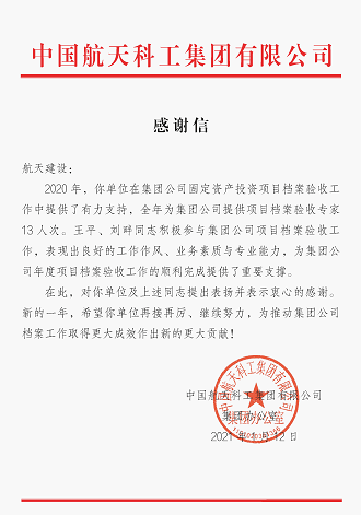 1月14日,中国航天建设集团有限公司收到中国航天科工集团有限公司发来的感谢信。信中,对航天建设所属航天设计院在集团公司固定资产投资项目档案验收工作中提供的有力支持表示衷心感谢。对航天设计院文档中心王平、刘畔同志积极参与集团公司项目档案验收工作,表现出良好的工作作风、业务素质与专业能力,为集团公司年度项目档案验收工作的顺利完成提供重要支撑提出表扬。并希望新的一年,航天建设所属航天设计院再接再厉、继续努力,为推动集团公司档案工作取得更大成效作出新的更大贡献!