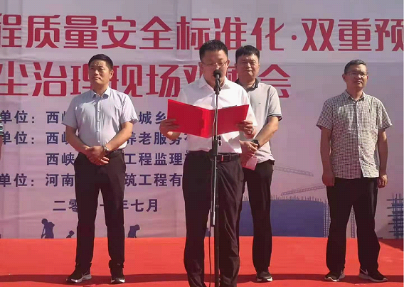 西峡县惠民养老服务有限公司建设方代表张孟贺,西峡县住建局党组书记、局长谢身正,南阳市住建局质量安全监管科科长崔晓东先后发表讲话,对惠民养老中心项目的施工建设工作表示充分肯定,项目自施工以来亮点突出,项目管理水平在全县一直名列前茅,充分展现了央企风采并预祝观摩会圆满成功。
