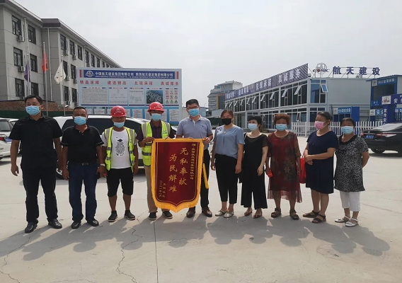 近日,河南省开封市禹王台区光明社区领导、光明社区群众代表一行7人,专程前往航天建设所属陕西航天建设集团有限公司第十六公司开封曲江雅集项目部,赠送锦旗,感谢项目部在抢险救灾工作中对光明社区的帮助。
