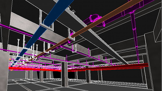 为确保地下室结构洞口预留及管线安装一次成优,技术人员在初期建立的BIM模型基础上对照现场情况进行模型深化与重点优化。模拟碰撞一旦出现问题,他们就带着图纸从办公室奔赴现场,对照现场数据与模型细节寻找问题关键点。经过多次打磨,初步确认深化设计方案,召集施工班组进行交底讨论,确认方案无误可实施后,再严格按图纸进行施工,最大可能消除返工风险,缩短了实际工期。