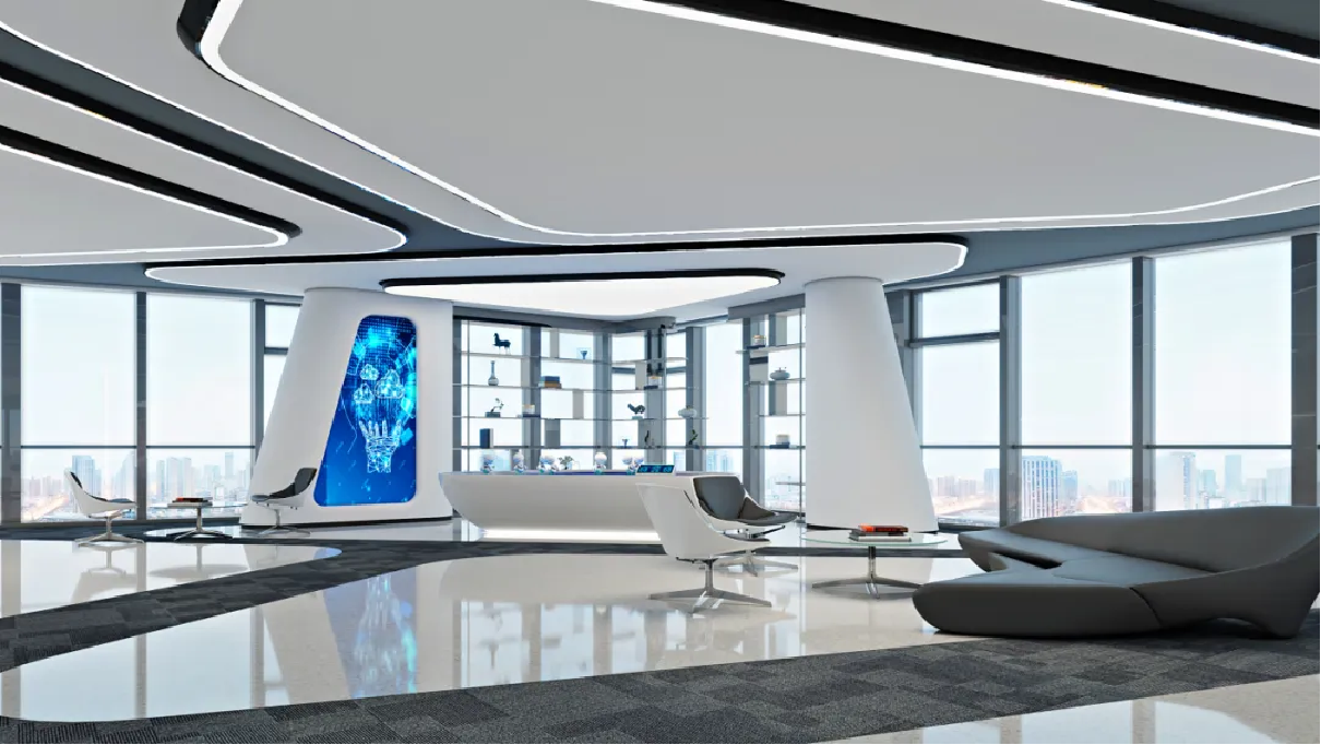 设计中,他们对不同功能区域进行合理的空间划分,根据各功能需求,规划清晰的动静分离系统。将办公区和会议区集中,避免与其他公共功能区的流动冲突,在设计元素上采用统一办公用房标准层基本模式、统一部门配套用房分配标准、统一公共部分办公标准“三个统一”设计思路,保证设计语言的一体性。餐饮区域通过开放式设计与木纹墙面和仿木纹穿孔铝板相结合,营造出轻松自然的社交氛围。为提升空间视觉效果,设计师充分发挥人体工程学上的心理隔离功能,巧妙运用透明隔断进行虚隔。在5G智能营业网点区域,通过嵌入式触控屏、动态光影效果和智能导向系统,提升用户的互动体验和便捷性。