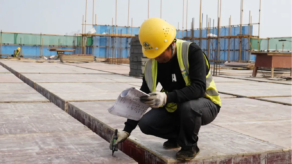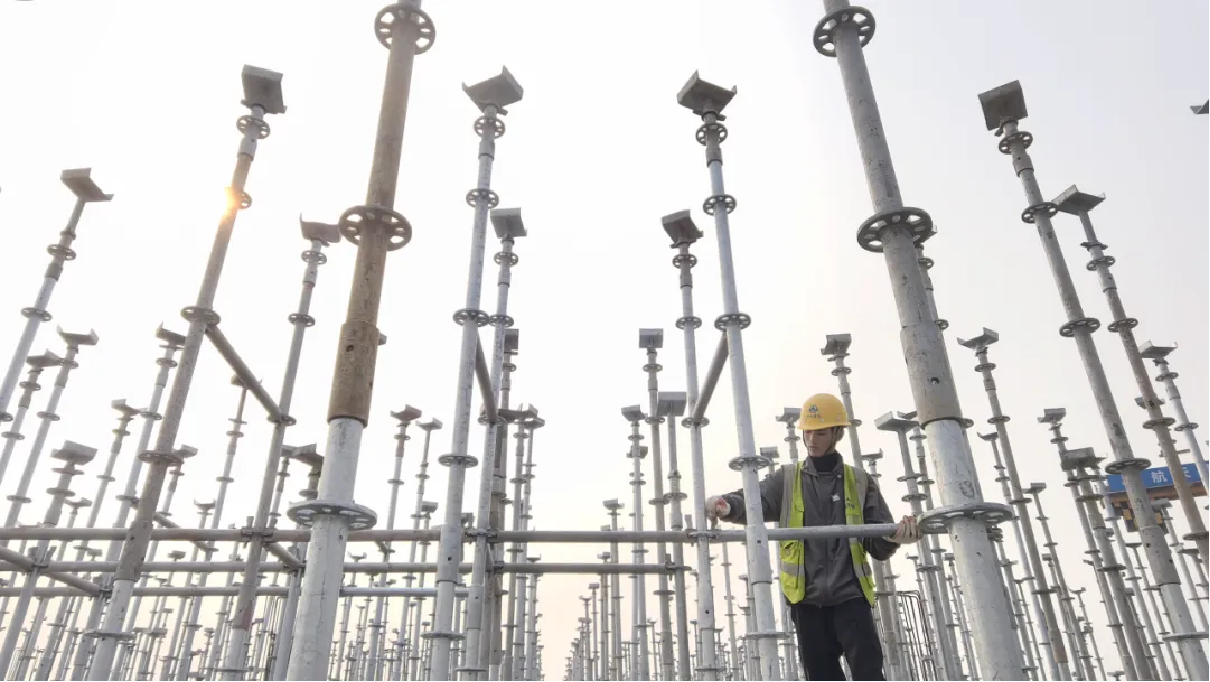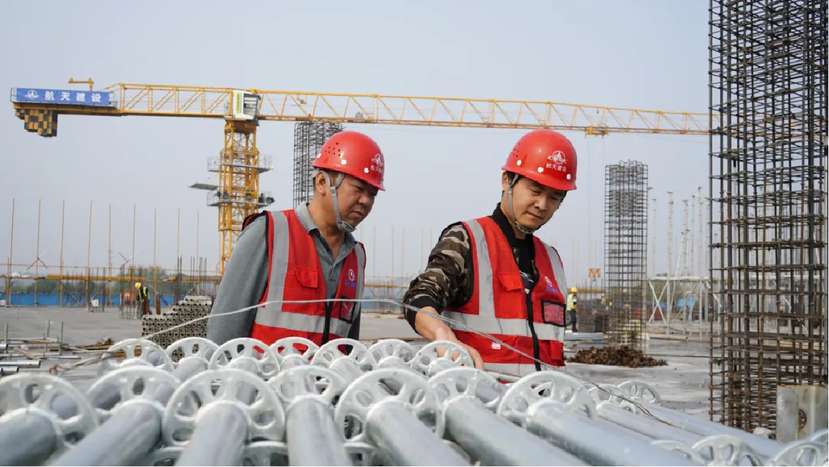 现场最吸引眼球的是一片横纵有序的银色支模架林,这是保障施工质量和进度的重要法宝——盘扣式支模架系统。相比传统扣件式支模架,盘扣式材料强度更高、防水防火防锈性能更好,其独特的结构便于快速安装。按照“一搭、二扣、三固定”的操作流程,只需一人一锤便可又快又好地完成搭建,高效施工的同时节省了人工成本。
