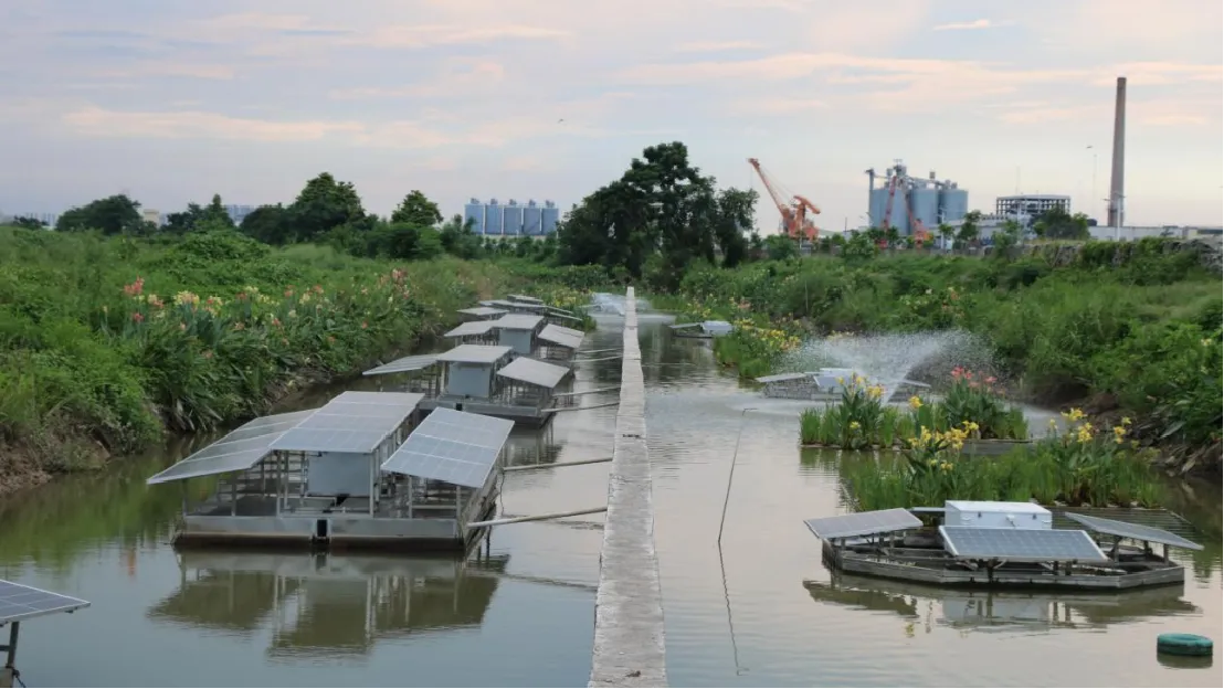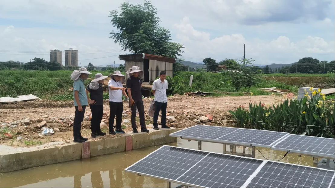 团队结合当地地势,在附近的田塱村统一排水终端处采用组合工艺,巧妙结合原有水渠建设养殖尾水治理设施,利用高效纤维填料对养殖尾水中的污染物进行有效消减,尾水处理后经泵站排到河涌。整套设施采用太阳能板光伏供电,高效生化处理设备去除水体中的有机物、氨氮等污染物;采用生态基净化设备进一步对水体做净化处理;光伏充氧设备在消解水中富营养物质的同时,对水体进行充氧,使得处理后的水质达到《城镇污水处理厂污染物排放标准》中的一级B标准。