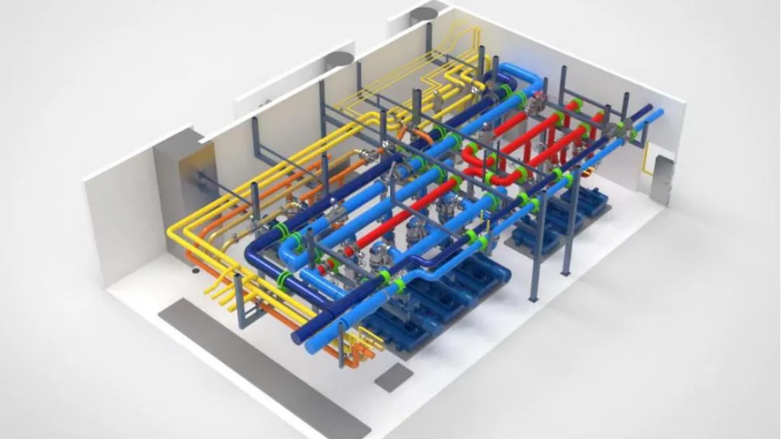 深化设计阶段,构建机房1:1三维可视化模型,对制冷机房和换热机房内全部管道、设备、阀门、支吊架进行全专业协同建模,通过碰撞检测提前化解管线交叉、设备碰撞等360余处问题;针对多规格管道及焊接+法兰分段连接需求,细化管段的分段安装方案,明确每段管道的切割尺寸、焊接节点和法兰位置,将设计精度贯穿至工厂预加工环节。