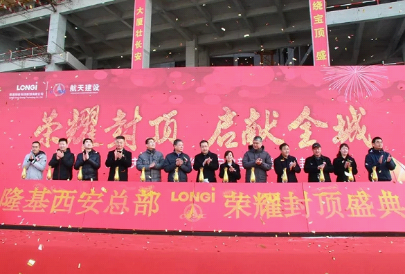 12月28日,随着最后一罐混凝土浇筑完成,光彩熠熠的金沙从主席台上飘扬撒下,航天建设所属陕西航天建筑工程有限公司建筑安装公司十八部承建的年产500MW高效单晶PERC光伏电池和3GW高效单晶光伏组件生产基地项目A1办公楼主体喜封金顶。西安市经开区管理委会副主任蔺建文,隆基股份支持服务中心总经理王晓哲,陕西航建总经理、党委副书记谢明娟,副总经理王明虎,安全副总监、安全管理部部长周期,建筑安装公司经理张柏生,党支部书记、副经理罗颖,安装十八部项目经理朱力等,以及各参建单位领导共同见证了这一精彩时刻。