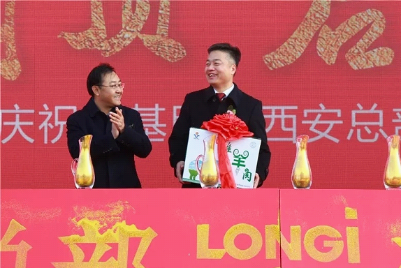 封顶仪式上,上级领导及建设单位在致辞中高度赞扬了十八部乐叶光伏项目施工管理各项工作,肯定了项目部取得的多个成绩。隆基集团领导还向朱力赠送了寓意吉祥的礼物,并表示将与陕西航建携手共进,打造精品工程,为地区乃至社会发展贡献力量。