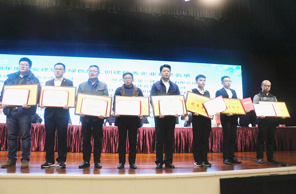 会上,对2018年绿色施工创建工作开展成果显著的企业做出表彰,陕西航建被评为2018年度“西安建筑业绿色施工创建优秀企业”,谢明娟被评为“建筑节能行业优秀企业家”。张玉豪、郑军、刘亚军三名同志被评为“建筑节能行业优秀个人”。所属二公司交大前沿科技楼、周至幸福大健康、安装公司隆基乐叶光伏生产基地项目被授予第十二批绿色施工项目立项奖牌。