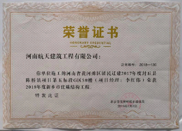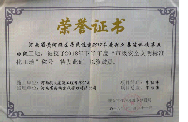 三月里,阳光明媚,温暖的春风也给河南航天建筑工程有限公司(以下简称公司)送来了好消息,陈桥五标项目部勇夺公司新一年的“开门红”,公司第二项目经理部黄河滩区居民迁建陈桥五标项目(以下简称陈桥五标项目)在获得“新乡市优质结构工程”荣誉后再接再厉,又斩获“新乡市安全文明标准化工地”荣誉称号。