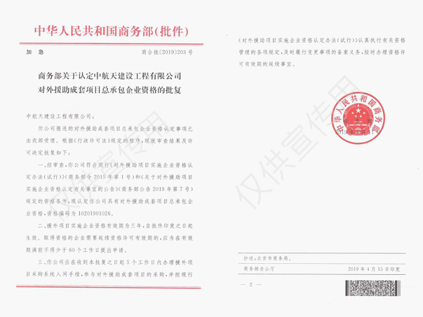 对外援助成套项目总承包企业资格的申请非常严格,只有特级企业和全国排名前100家一级企业才有资格申请。援外项目是海外工程领域的优质板块,作为航天建设 唯一一家施工总承包特级企业,成功获批此项资格,是商务部对中航天的高度认可,也是对外展示企业形象的平台和企业综合实力的象征。