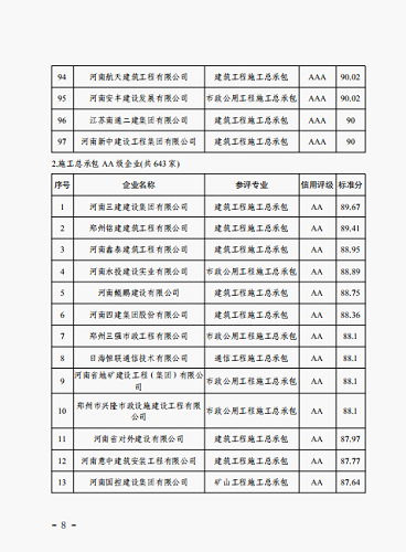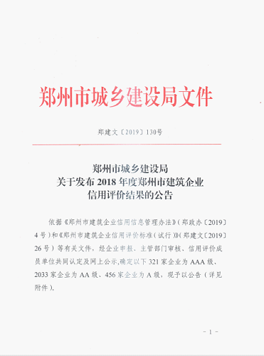 “信用既是无形的力量,也是无形的财富。”是企业发展的生命线。人无信不立,对于企业而言同样如此,良好的信用是企业的生命和基石。2019年6月,郑州市城乡建设局发布了“关于发布2018年度郑州市建设企业信用评价结果的公告”,河南航天建筑工程有限公司(以下简称公司)被评为“AAA”级信用企业。