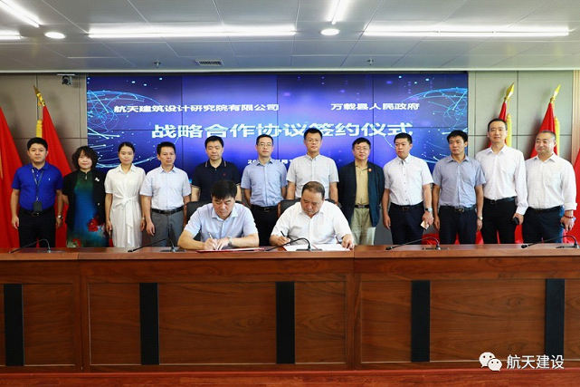 航天建设党委副书记、董事、总经理李治国出席会议,双方领导进行了深入友好的会谈,在双方参会人员的共同见证下,航天建筑设计研究院有限公司党委书记、董事长马向东和万载县人民政府县长曾文军签署了《合作协议》。