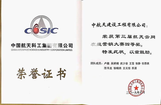 7月16日,中国航天科工集团有限公司第三届航天云网在线营销大赛圆满落幕。航天建设所属中航天建设工程有限公司云端营销团队,在近400支参赛团队的激烈角逐下斩获了四等奖的优异成绩。