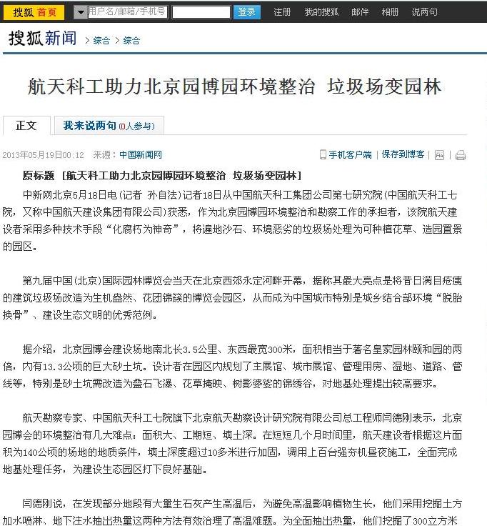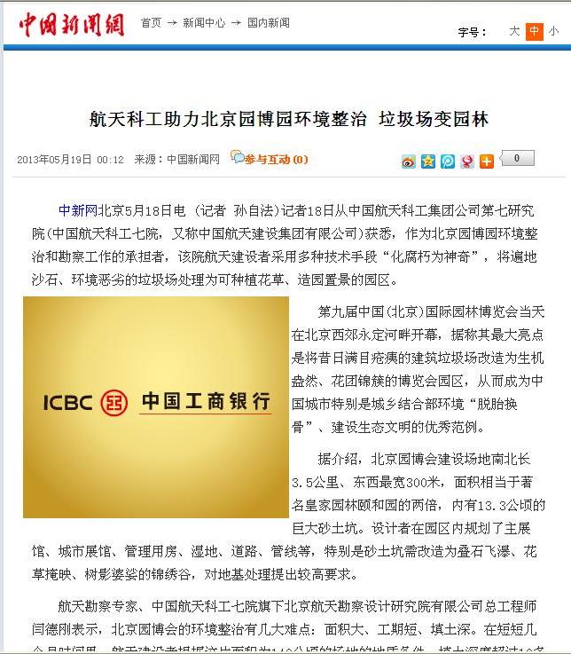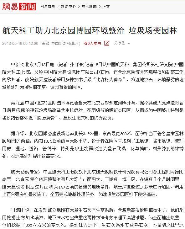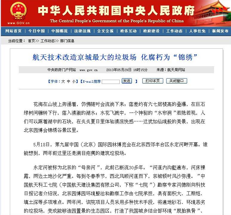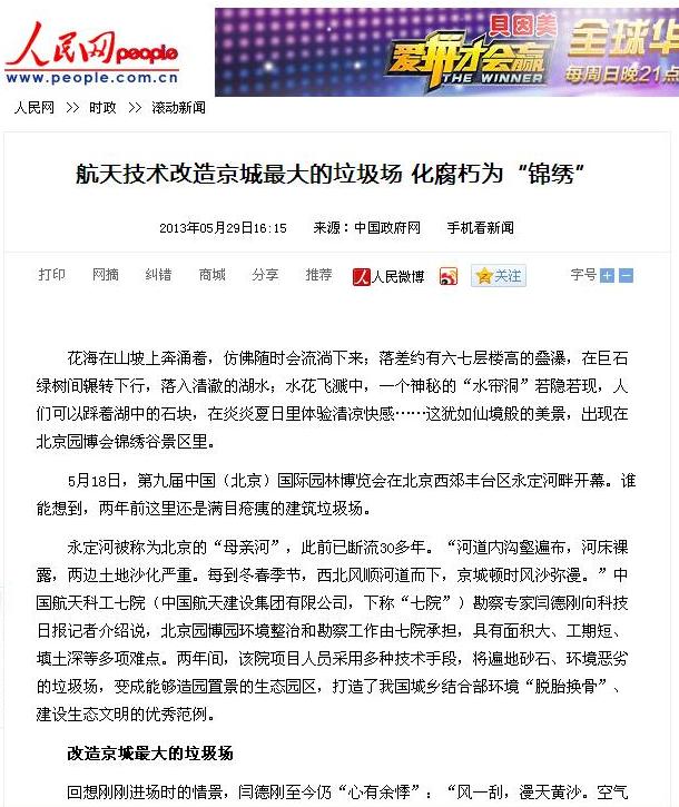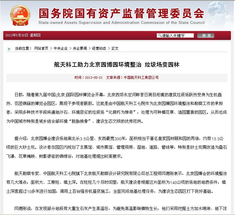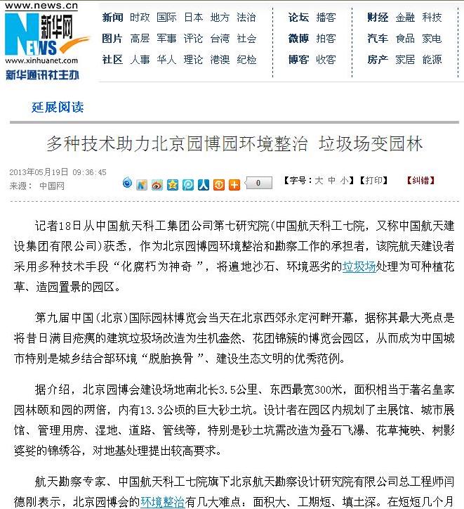 其中5月26日出版的《科技日报》在一版主打位置刊发长篇通讯,中国新闻网5月18日发布消息,对航天建设整治园博会环境作了重点报道。十余天来,中华人民共和国中央人民政府网站、国务院国有资产监督管理委员会网站、国家航天局网站、中国航天科工集团公司网站、新华网、人民网、搜狐网、网易、光明网、中国科技网、中国经济网、中国青年网、凤凰网、中国网、环球网、新民网、华龙网、东方网、慧聪网、文新传媒、21CN、大众网、和讯网、新浪微博、腾讯微博等近百家网站、微博、论坛进行了转载。