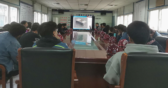 在会议室,师生们共同观看了中航天企业宣传片,对中航天积淀几十载的企业发展历史有了更深层次的了解。随后,张建强以PPT的形式对3-3项目从新技术、新工艺、新思维、新方法的应用上分别做了详细的介绍。