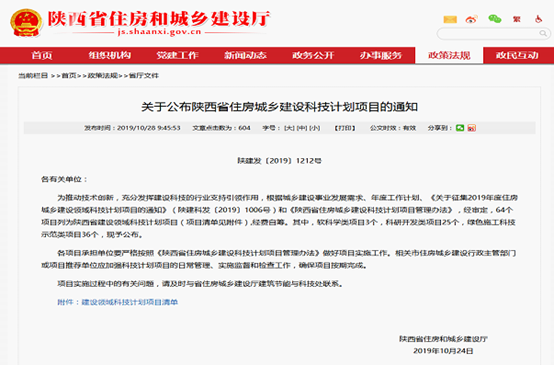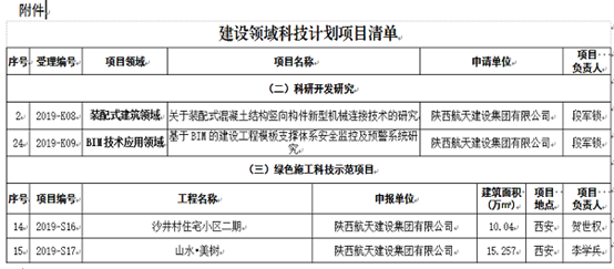 10月24日,陕西省住房和城乡建设厅(下简称省住建厅)发布了《关于公布陕西省住房城乡建设科技计划项目的通知》(陕建发〔2019〕1212号)。航天建设所属陕西航天建设集团有限公司申报的“关于装配式混凝土结构竖向构件新型机械连接技术的研究”等两项科研项目和“沙井村住宅小区二期项目”等两个项目获省住建厅立项,成为2019年度陕西省建设领域科技计划项目。