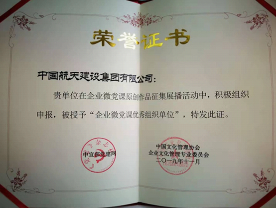 在第六届“最美企业之声”表彰中,航天建设文集《七院榜样(第一辑)》荣获最美形象之声,所属航天设计院、中航天视频作品荣获最美传播之声。此外,航天建设荣获企业微党课优秀组织单位,中航天作品《家国的守望》荣获微党课优秀作品。所属中瑞公司研究成果《关于建筑企业在工程项目管理中开展项目党建工作的研究与探讨》荣获新时代企业党建实践创新优秀成果,幷编入红旗出版社成果书籍。同时,航天设计院、中航天荣获新中国成立70周年企业宣传思想文化先锋70强,4名个人分获企业文化突出贡献人物、企业党建文化杰出人物、企业文化先进工作者等称号。此外,陕西航建、湖南航建等单位作品也分别上线光明网进行展播。