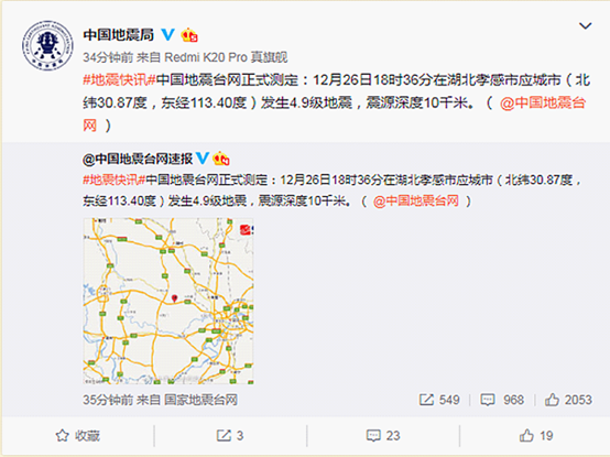12月26日18点36分,在湖北孝感市应城市附近(北纬30.87度,东经113.40度)发生4.9级地震,震源深度10千米。震中周边多市震感强烈,武汉、荆州、襄阳、宜昌、信阳、荆门、咸宁等地震感明显。