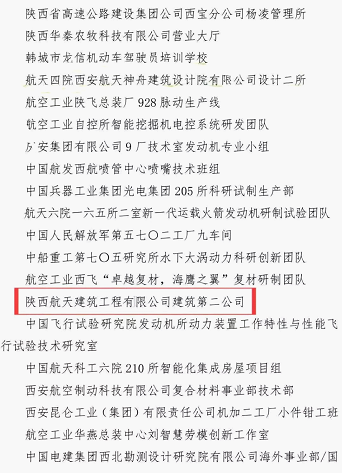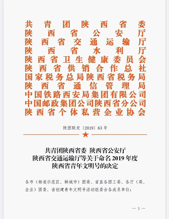 2019年12月31日,由共青团陕西省委、陕西省公安厅、陕西省交通运输厅等单位联合印发了《关于命名2019年度陕西省青年文明号的决定》(陕团联发[2019]63号)。中国航天科工航天建设所属陕西航天建设集团有限公司第二公司荣获“陕西省青年文明号”荣誉称号。