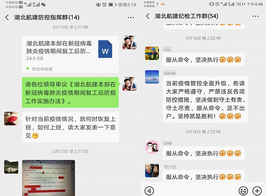 航天建设纪委制定下发了《中国航天建设集团有限公司关于做好新型冠状病毒感染肺炎疫情防控监督工作的通知》,对监督工作进行全面部署,明确监督工作重点,建立异常情况报告机制,为各级纪检组织和纪检干部精准有序开展疫情防控监督打下坚实基础。湖北航建身处疫情的高危地区,公司纪委将监督工作前移,督促本单位防控保障组、经营生产保障组做好防控物品的购置工作,并参与到企业疫情防疫宣传工作中,既做好对干部职工的宣传引导,也从纪律方面提出要求,要求党员干部带头遵守疫情防控期间各项要求,带头利用微信、电话等手段,做好政策宣贯和心理疏导,带头约束好亲属。