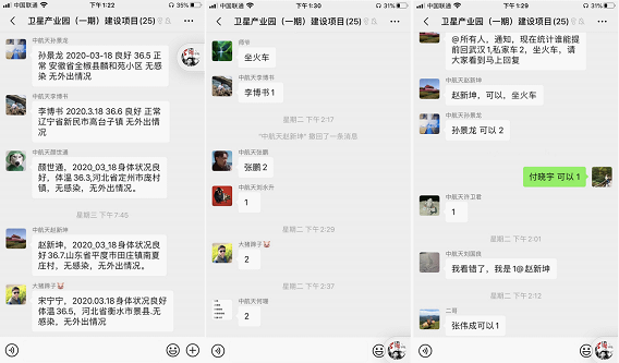 2020年3月18日,航天建设所属中航天建设工程集团有限公司(卫星公司施工单位)管理人员提前返岗审批通过。