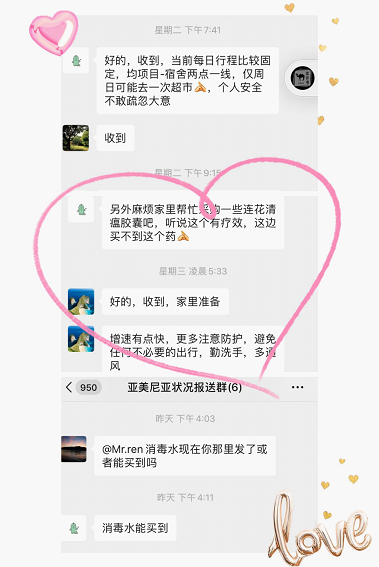 在为共同“战疫”组建的亚美尼亚状况报送群里,国内的同事们和任思同保持着密切联系,两国虽有时差,但双方每天都往返交错着问候与关心,分享着官方的最新疫情消息和防疫措施。每天一大早,一综院国际工程处的同事们办公第一件事就是登陆世卫组织官网和驻地公众号,关注那里的最新疫情信息。每天夜里,也就是亚美尼亚当地时间的傍晚,在结束一天的驻场工作后任思同都会把《职工行程日记表》发至群里,大家在得知他那边一切正常后方才安心。