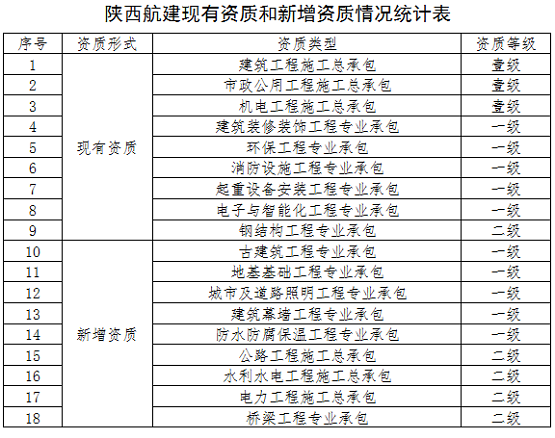 近年来,在陕西省住建厅的大力支持下,陕西航建积极推进企业资质提升,持续优化企业管理体系,此次连续获批建筑幕墙工程、城市及道路照明工程、防水防腐保温工程、地基基础工程、古建筑工程五个专业承包一级,水利水电工程、公路工程、电力工程三个总承包二级,桥梁工程一个专业承包二级资质,目前公司资质已达18项。这是公司资质拓展的重大突破,既为公司转型升级和决战决胜“十三五”拓宽发展之路,也为公司开疆拓土和“十四五”发展扬帆起航奠定坚实基础。(吴秋莉/文)
