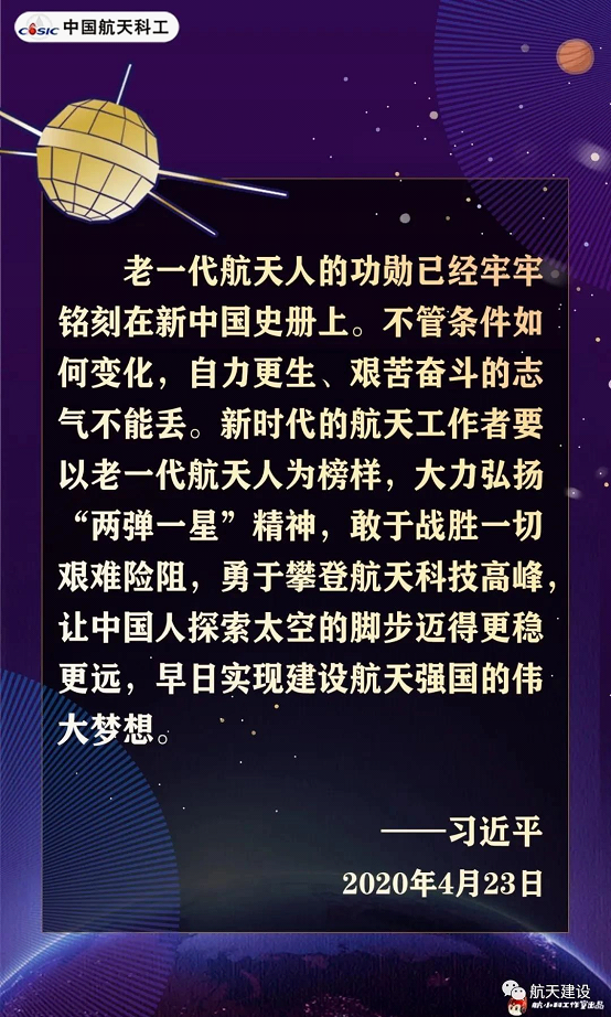 2020年4月24日,在第五个“中国航天日”和“东方红一号”卫星成功发射50周年到来之际,中共中央总书记、国家主席、中央军委主席习近平4月23日给参与“东方红一号”任务的老科学家回信,向他们致以诚挚的问候,并就弘扬“两弹一星”精神、加快航天强国建设向广大航天工作者提出殷切期望。