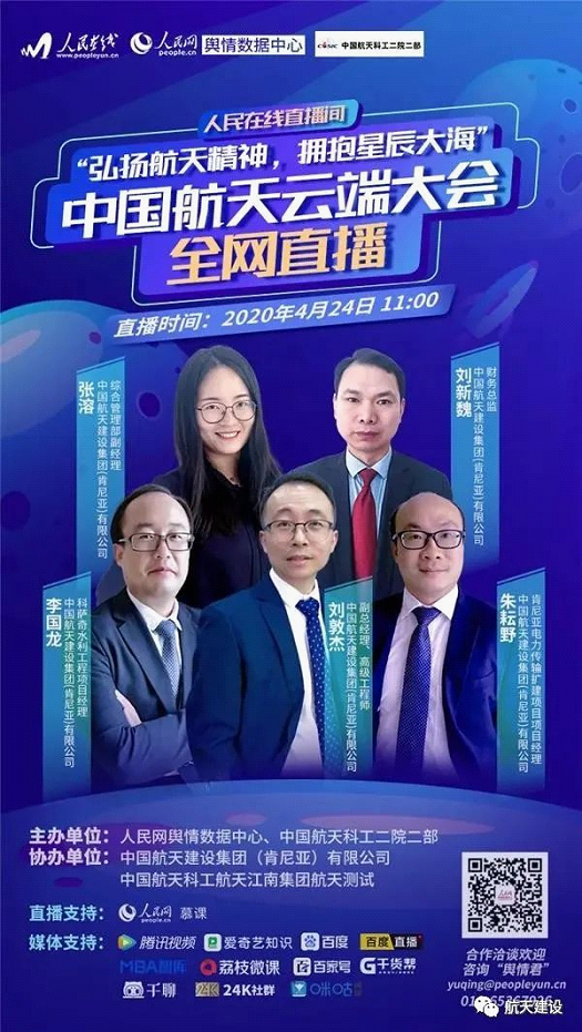 今年是第五个中国航天日,肯尼亚公司受邀代表航天建设参加了由人民网舆情数据中心的“2020年中国航天云端分享大会”。全网直播期间,分别由肯尼亚公司副总经理刘敦杰、科萨奇水利工程项目经理李国龙、肯尼亚电网扩建项目项目经理朱耘野、公司综合管理部副经理张溶分享了航天建设开拓国际化事业的心路历程,分享了在疫情期间仍然坚守海外一线的心得体会。共同寄语海内外航天人能够同心协力弘扬航天精神,携手并肩拥抱星辰大海。