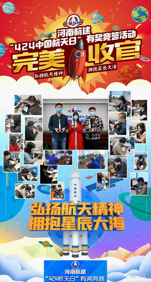 4月24日,在第五个“中国航天日”到来之际,湖北航建通过各微信群,发送“弘扬航天精神 拥抱星辰大海”主题电子宣传海报和庆祝活动通知,组织全体员工,在公司微信公众号上,学习航天知识、观看“航天四老”先进事迹视频、进行航天知识有奖竞答,旨在进一步弘扬航天精神,号召员工攻坚克难,为圆满完成年度目标任务贡献力量。