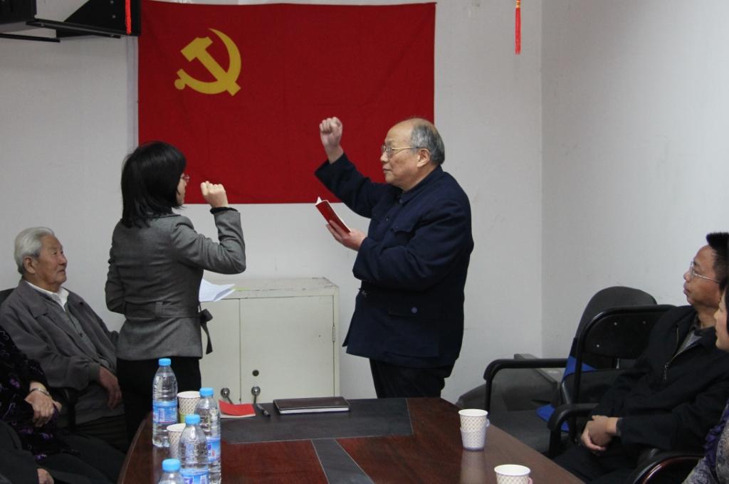 “我志愿加入中国共产党,拥护党的纲领,遵守党的章程,履行党员义务……”前不久,在永定路街道八街坊西社区居委会,林家丰老人左手持党章,右手紧握成拳高高举起,面向党旗铿锵有力地宣读着入党誓词,身体微微地颤抖。
