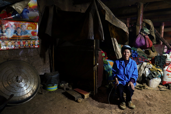 在九都乡觉莫村二组,记者走进了村民莫色么吃作的房子,用土坯、木头、茅草建成,一片漆黑、四处漏风,火塘的柴禾熏得屋子黑黢黢,木棍、木板、塑料布搭成“床铺”,牛、羊、鸡与人共享一间屋子,牛粪的味道十分强烈。