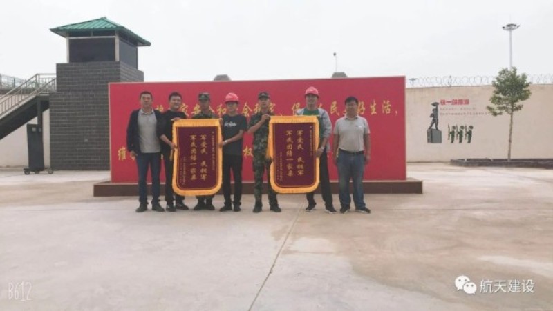 7月19日,中国人民武装警察部队新疆策勒中队将印有“军爱民 民拥军 军民团结一家亲”的锦旗送到了航天建设所属陕西航建承建的新疆策勒县2019年园区公租房建设项目上,赞誉陕西航建对武警部队的真诚拥护,感谢项目部对武警策勒中队的无私帮助。