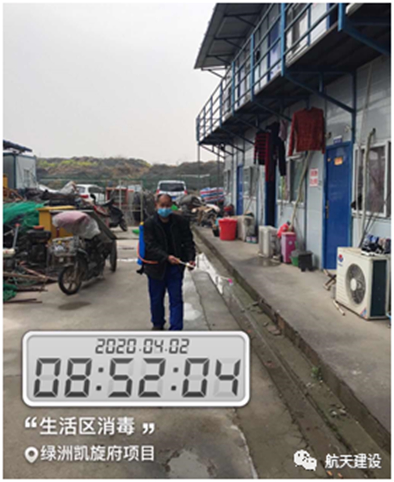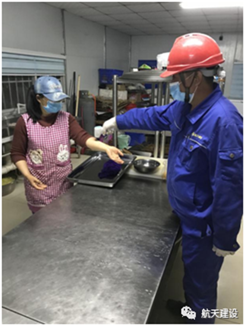 受疫情影响,原外地施工班组暂不能返工,为“保工期抓进度”,项目部决定临时使用大量当地工人,同时为确保防疫安全,以安全经理郭凯为负责人的疫情防控小组,自3月1日起,每天早晨6:00准时到达门岗,对进场工人维持安全距离、测量登记体温、分发口罩、进行防疫工作宣传,并按区域和工种详细核对信息,同时对办公区、生活区、厨房、卫生间等进行全面消杀工作。