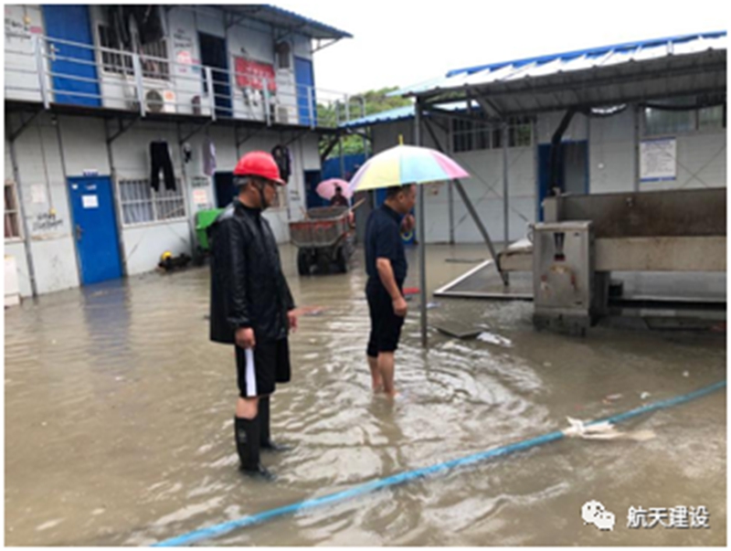 进入6-7月份,当地雨水增多,为防止突然出现险情,项目部提前按照雨季施工方案做好预防工作,对外架密目网、临建房屋屋面、现场临时用电、防汛水泵、沙袋等进行专项检查和整改。
