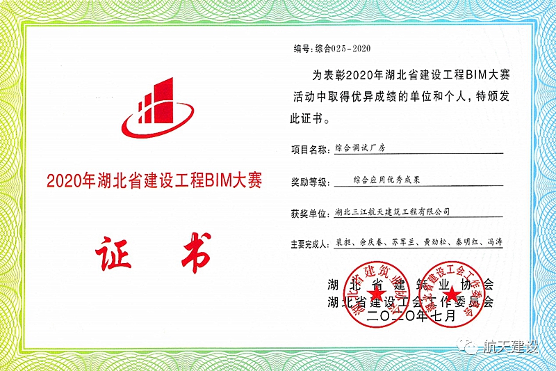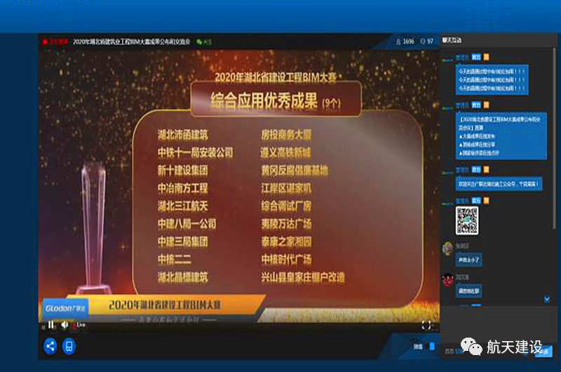 为做好疫情防控,本次会议采用线下小型会+网上直播的形式进行,此次大赛有来自17个地市州推荐的共计93项成果作品参赛,湖北全省线上、线下90多家企业共计 2000多人参加此次会议。经过专家组初审、初评、答辩、终评等评审程序,层层选拔,湖北航建综合调试厂房项目BIM技术的应用从众多作品中脱颖而 出,荣获优秀奖。