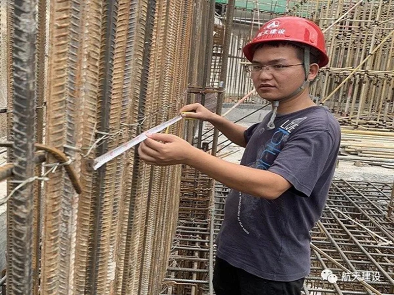 ●8月8日,恩施欣华理想城五期项目,技术员柯伟,顶着38℃高温,手拿卷尺,测量挡土墙竖向钢筋间距。