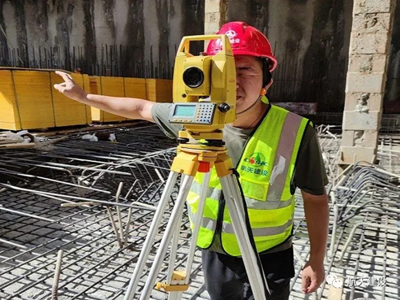 ●8月10日,武汉银湖中心项目,技术员何泽豪,顶着37℃高温,利用全站仪,测量基坑筏板边轴线点,保障强度定位。