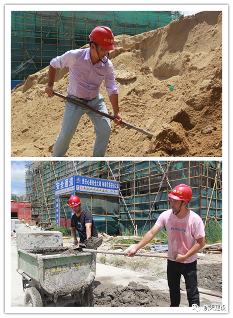 ●8月13日,孝感湖北工程学院项目,技术负责人魏智平带领青年突击队成员,顶着烈日,协助现场工人铲沙土、拌砂浆,抢抓施工生产进度。