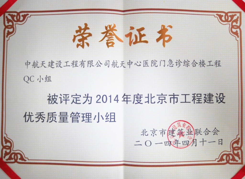 在中航天的历史上,这是第一次组队参加如此规模盛大的QC成果交流会。为参加本次交流会,中航天进行了精心的组织安排。在航天建设集团、中航天各级领导的大力支持下,在刘振东、徐伟、付光磊、彭荣康等员工的不懈努力和积极争取下,中航天力克群雄,斩获佳绩。通过参加本次QC成果交流会,为中航天选拔培养了一批QC管理的优秀人才,提升了中航天QC管理人员队伍整体素质,为中航天公司航天中心医院门急诊综合楼工程、阜成路八号院38#职工住宅楼等6项(职工住宅楼)申报鲁班奖奠定了坚实的基础,将对中航天后续开展工程创优起到积极的示范引导作用。同时,本次获奖改写了中航天QC成果获奖的历史,也改写了航天建设京区施工单位QC成果获奖的历史,意义十分重大,影响十分深远。(刘振东)