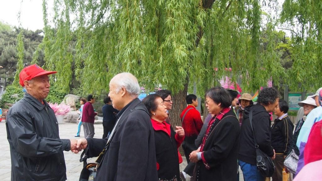 老同志们沿着玉渊潭湖畔健步前行,大家精神矍铄,三五成群,欢声笑语,祥和的气氛成了公园里的一道风景。
