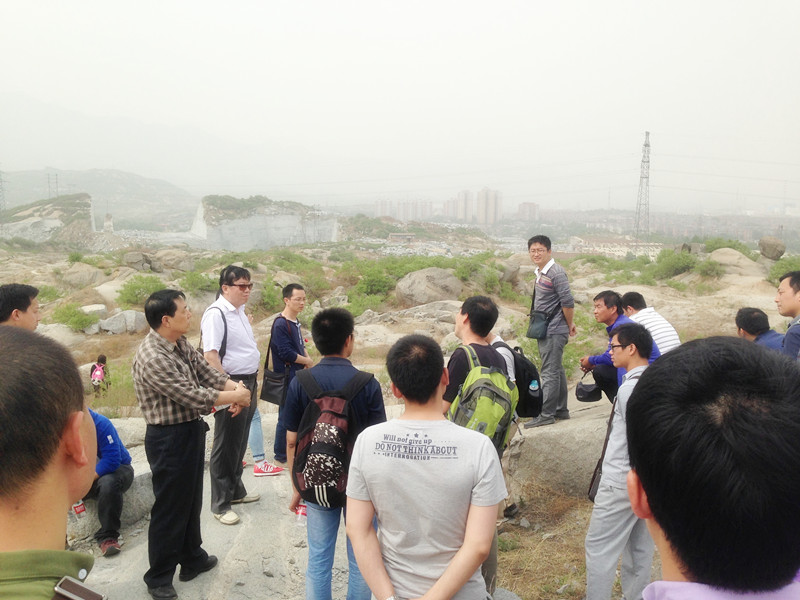 最后一站,孙老师带领大家来到房山车厂村,首先向我们介绍了花岗岩的岩石特征,它是地表最常见、用途最广的岩石之一,由于花岗岩质地坚硬,且不易被水溶解,不易受酸碱的侵蚀,因此是建筑石材的上选。同时以花岗岩类的硬质岩作为建筑物基础持力层,具有承载力高、稳定性好,抗震性强的特点,这正是房山区的著名企业燕山石化公司坐落于此的原因。车厂村也是一部分坐落在房山花岗岩体之上,另一部分位于马家沟组灰岩围岩上,随后孙老师带领大家参观了出露于地表的花岗岩体和球形风化,引领大家从高处眺望太平山南侧向斜地形。孙老师简单介绍了该岩体主要由花岗闪长岩组成,中间穿插伟晶岩脉和石英岩脉,并讲解了相关的岩石矿物组合。大家饶有兴趣地和院领导及孙老师一同探讨,一同交流工程中遇到的一些地质相关问题。大家非常珍惜此次活动机会,俯身观察伟晶岩脉中肉眼可见的黑云母矿物,回顾了岩石矿物学的基础知识。