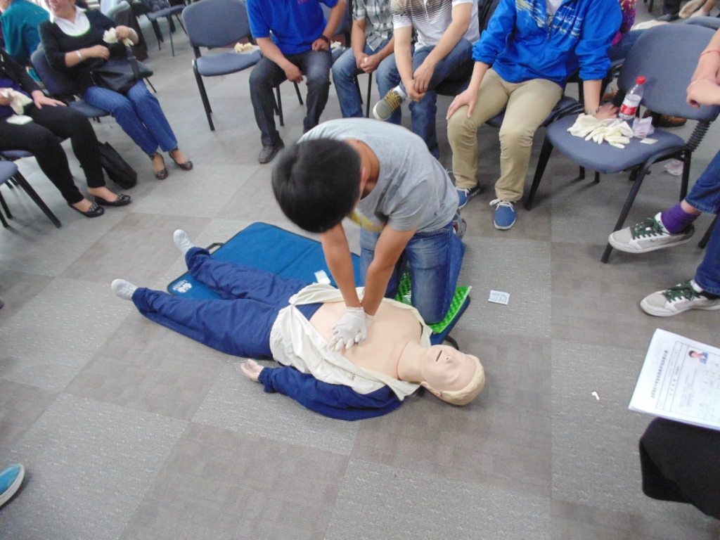 整个培训活动分为急救知识讲座和实践操作两个部分。在上午的知识培训会上,北京市丰台区急救中心的杨老师首先介绍了红十字会的有关知识,包括红十字运动的起源、组织机构、标志、基本原则及中国红十字会发展历程等基本知识,并通过生动的案例给大家讲解了紧急救护在日常生活中的重要性,接着进行了详细的救护知识培训讲座,讲座的内容主要包括两个方面:心脏骤停的心肺复苏方法和气道异物阻塞的急救方法。杨老师向大家着重讲解了心脏骤停的救护措施,并且现场演示了人工呼吸、胸外按压、自动体外心脏除颤器的使用方法操作演练。