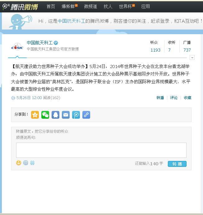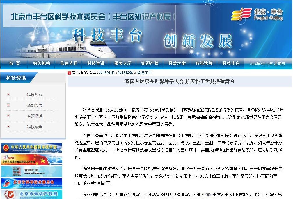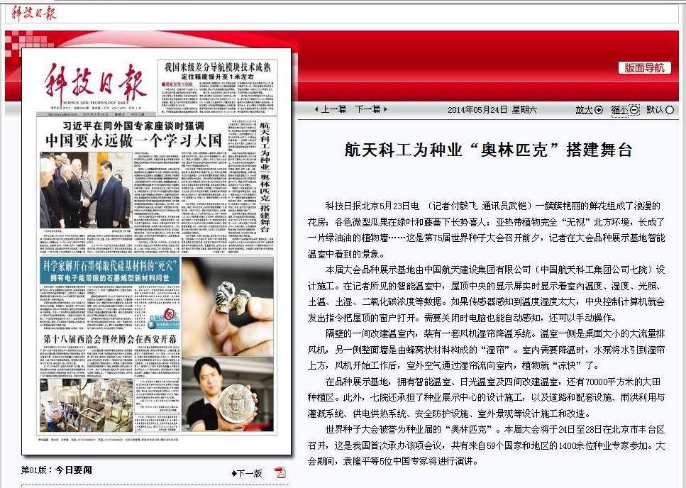 《科技日报》、《中华建筑报》、《中国军工》、《国企》、《中国航天报》等报刊,中国科技网、中国建筑新闻网、和讯网、国防科工局网站、中国航天科工网等网站,中国航天科工微博、中国航天科工官方微信、航天文创微博以及国内多家建筑、军工、农业、环境、育种领域网站,对航天建设助力种子大会进行了报道。