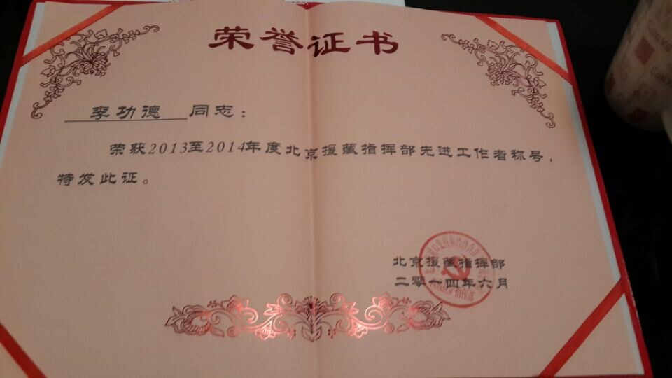 6月20日,北京市对口支援和经济合作工作领导小组西藏拉萨指挥部(以下简称北京援藏指挥部)在拉萨市柳梧大厦11层会议室召开2014年度总结表彰大会,航天七院工程总承包部拉萨项目部项目经理李功德作为拉萨市群众文化体育中心管理单位代表荣获北京援藏指挥部2013-2014年度先进工作者荣誉称号。