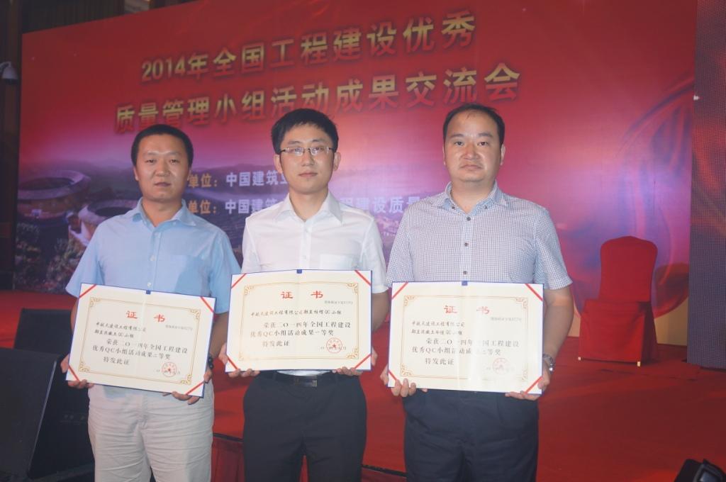经航天工程建设分会组织专家严格审查后推荐,2014年7月,在2014年度全国工程建设优秀质量管理小组活动成果交流会上,中航天公司部直项目柱帽QC小组从全国29个地区、17个行业协会推荐的875个优秀QC小组中脱颖而出,一举荣获2014年全国工程建设优秀QC小组一等奖。这是全国工程建设优秀质量管理QC小组活动成果近年来申报数量最多的一年,也是申报地区和行业数量最多,竞争特别激烈的一年。该奖项的获得对外展现了航天建设集团工程质量管理的高水平。