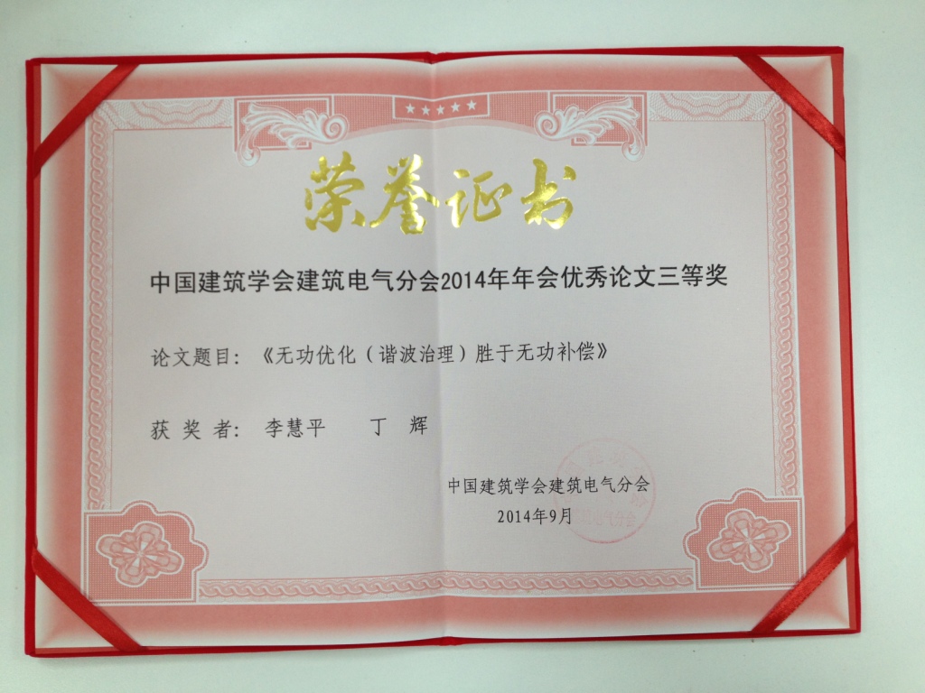 我院青年设计师业务成果再获喜讯, 2014年9月,中国建筑学会建筑电气分会在上海召开了成立30周年年会暨学术交流会,两篇论文。我院一分院设计师丁辉撰写的两篇论文《无功优化(谐波治理)胜于无功补偿》和《在线式高效谐波治理技术及其应用》在该年会上均获得三等奖。中国建筑学会建筑电气分会第八届理事会常务理事、我院科技委常委王勇总工代表我院出席了本次年会。
