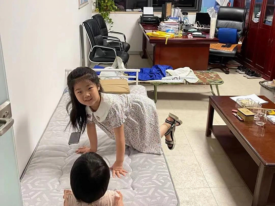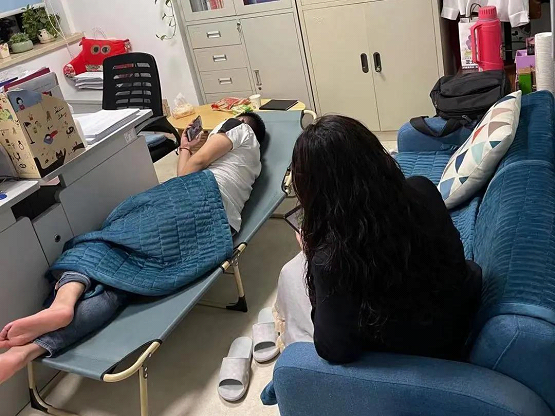 在临近下班时,“今晚怎么过”又成了一部分员工的选择题。好在公司有电、有水、有网、有饭,因此还是有不少员工选择继续留宿在办公室,也有带上家属一起来“避难”的。此刻,公司就是家,是员工避风挡雨的港湾,更是他们坚强的后盾。
