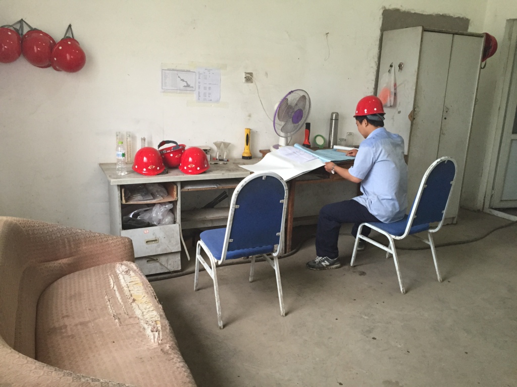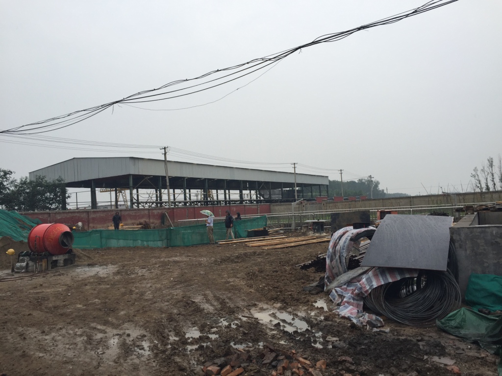 天下着小雨,施工现场道路变得泥泞不堪,工人们正冒雨进行施工。工地西北角的项目指挥部紧邻着原有的制药废水处理设施,破旧的工作间内不时可以闻到从外面传来的难闻味道。